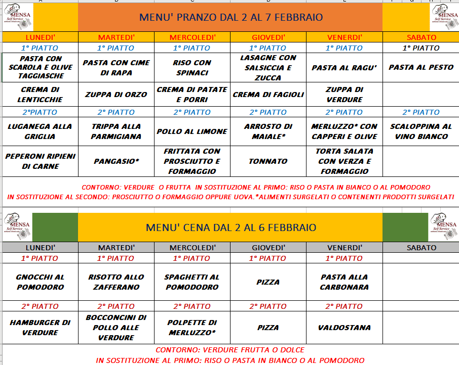 Per il pranzo e la cena è data la scelta di un menù settimanale vario, generalmente con tre primi, tre secondi, formaggio, contorno, frutta e dolce.